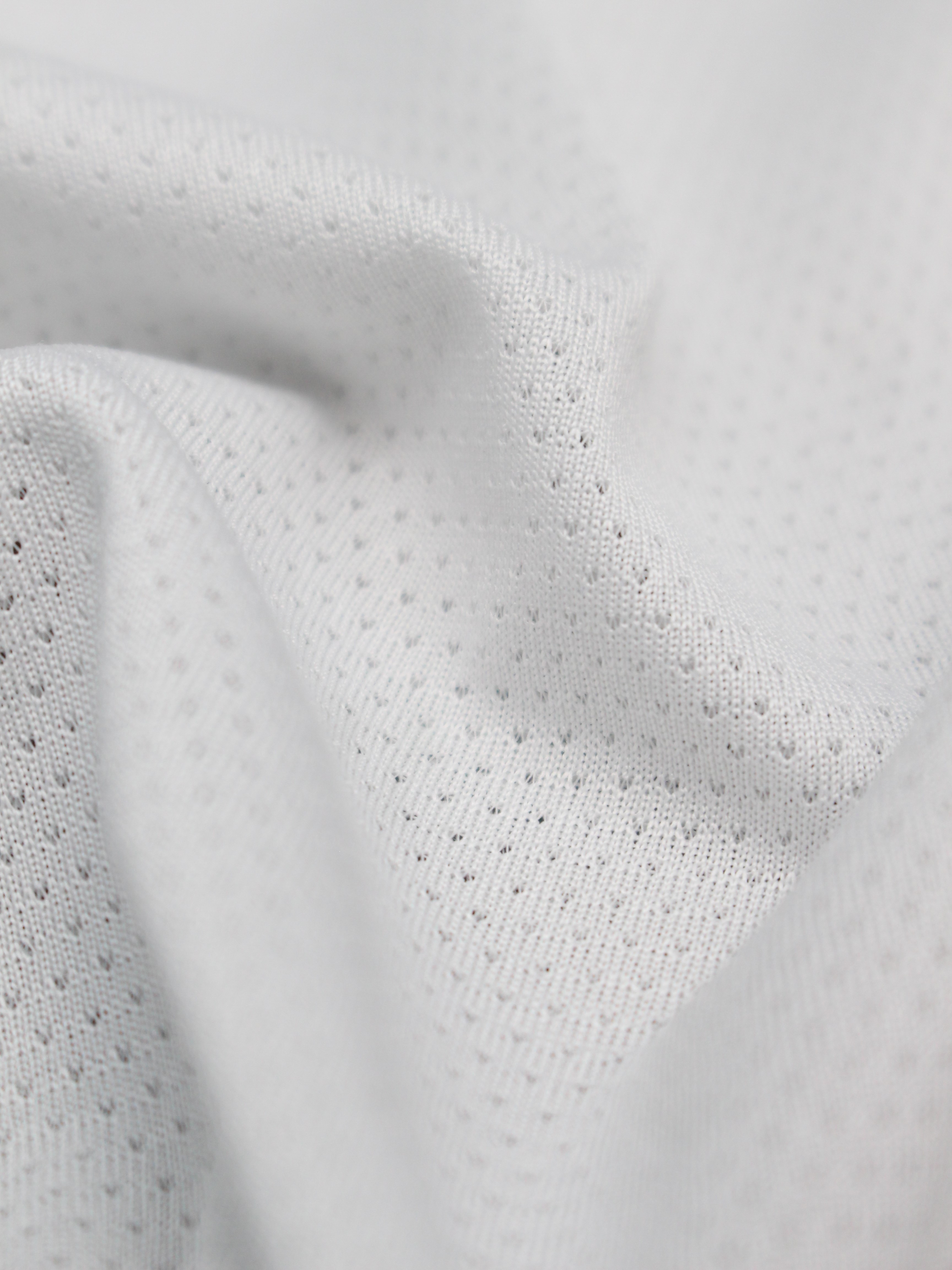 - Cấu trúc dệt: Dệt kim tròn (circular knit) sử dụng công nghệ jacquard, tạo nên các mắt lưới hình oval hoặc tròn nhỏ xen kẽ.